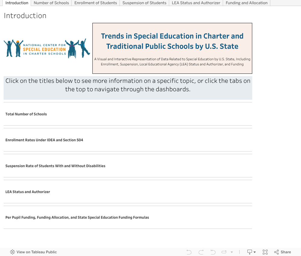 This interactive visual database is aimed at increasing understanding of the special education landscape and related trends across every state in the nation. Broadly, the database includes data on enrollment, suspension, local educational agency (LEA) status, authorizer, and funding. This database builds on information published in two of the Center’s reports, “Key Trends in Special Education in Charter Schools in 2015-2016: A Bi-Annual Analysis of the Civil Rights Data Collection” and “Getting Lost While Trying to Follow the Money: Special Education Finance in Charter Schools.”